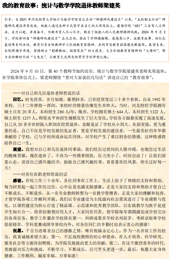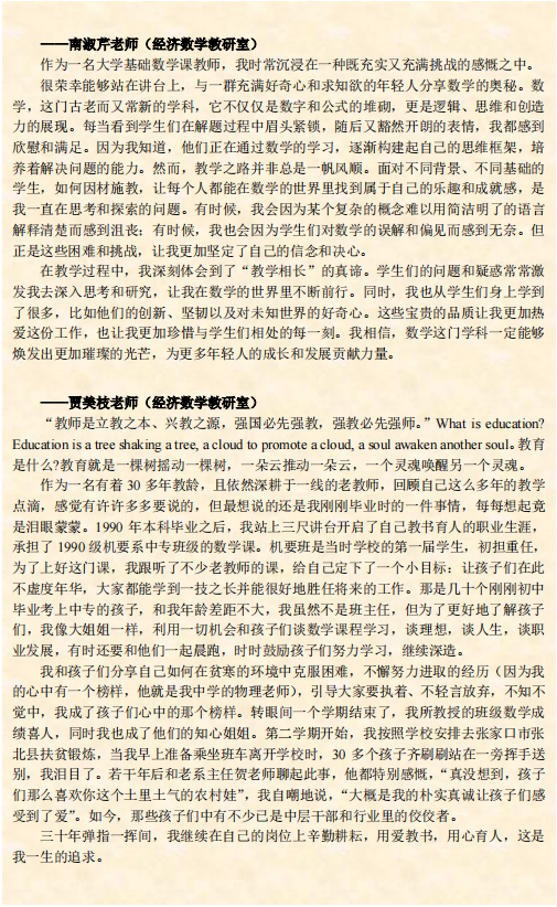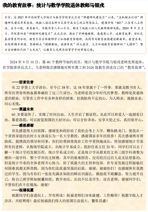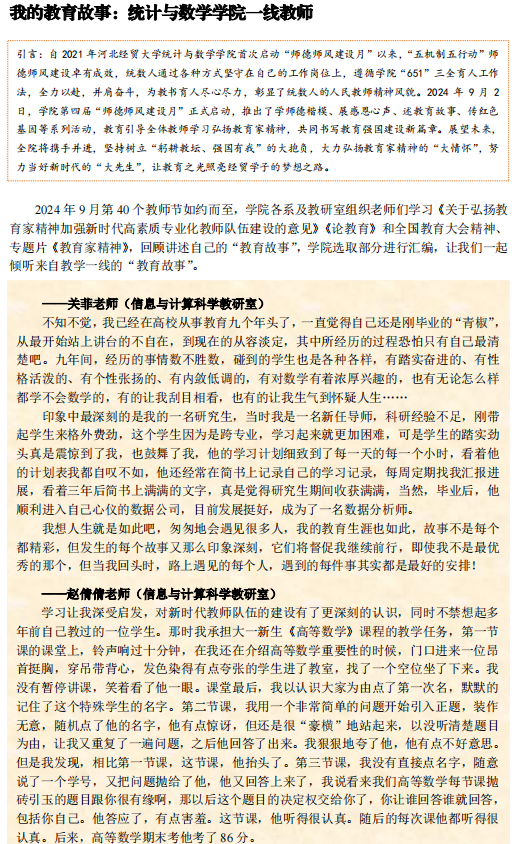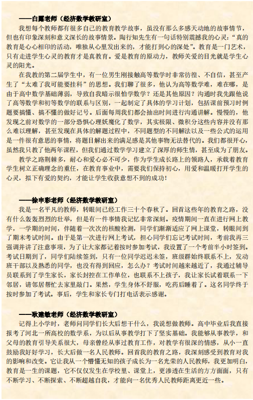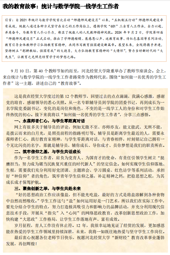 自2021年太阳成集团tyc7111cc首次启动“师德师风建设月”以来,“五机制五行动”师德师风建设卓有成效,统数人通过各种方式坚守在自己的工作岗位上,遵循公司“651”三全育人工作法,全力以赴,并肩奋斗,为教书育人尽心尽力,彰显了统数人的人民教师精神风貌。2024年9月2日,公司第四届“师德师风建设月”正式启动,推出了学师德楷模、展感恩心声、述教育故事、传红色基因等系列活动,教育引导全体教师学习弘扬教育家精神,共同书写教育强国建设新篇章。展望未来,全院将携手并进,坚持树立“躬耕教坛、强国有我”的大抱负,大力弘扬教育家精神的“大情怀”,努力当好新时代的“大先生”,让教育之光照亮经贸学子的梦想之路。