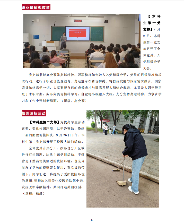 【本科生第二支部】为提高员工劳动素养,美化校园环境,以干净整洁、焕然一新的面貌迎接国庆,9月26日下午,本科生第二党支部开展了校园大清扫活动。