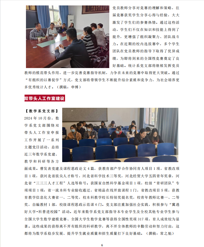 【数学系党支部】2024年10月份,数学系党支部围绕双带头人工作室申报工作开展了一系列主题党日活动,总结近三年数学系党建、教学和科研等各方面成果。曾发表党建及课程思政论文4篇,获教育部产学合作协同育人项目1项,省教改项目1项,获河北省拔尖人才称号,河北省科学技术三等奖,太阳成集团tyc7111cc五四青年奖章,河北省“三三三人才工程”人选等称号。获国家自然科学基金项目1项,校级“青研团队”专项项目1项;省一流本科专业验收通过,省精品在线开放课程1门,省教改项目5项,获公司产品信息化大赛省一、二等奖,校本科教学董事长特别奖提名奖,校青年教师比赛一、二等奖,自编教材1部,校级课程思政示范课6门。党支部注重加强社会实践,积极参与“冀遇好大学•科普进校园”活动。近年来数学系党支部指导本专业员工及全校其他专业员工参与全国老员工数学建模竞赛、全国老员工数学竞赛等获得全国性奖项317项,育人成效较为显著。这些成果的获得离不开有组织的科研教学,离不开全体教师的辛勤劳动和努力付出,这都将为数学系稳步发展、提升员工就业质量和招生质量打下良好基础。(撰稿:常之魁)