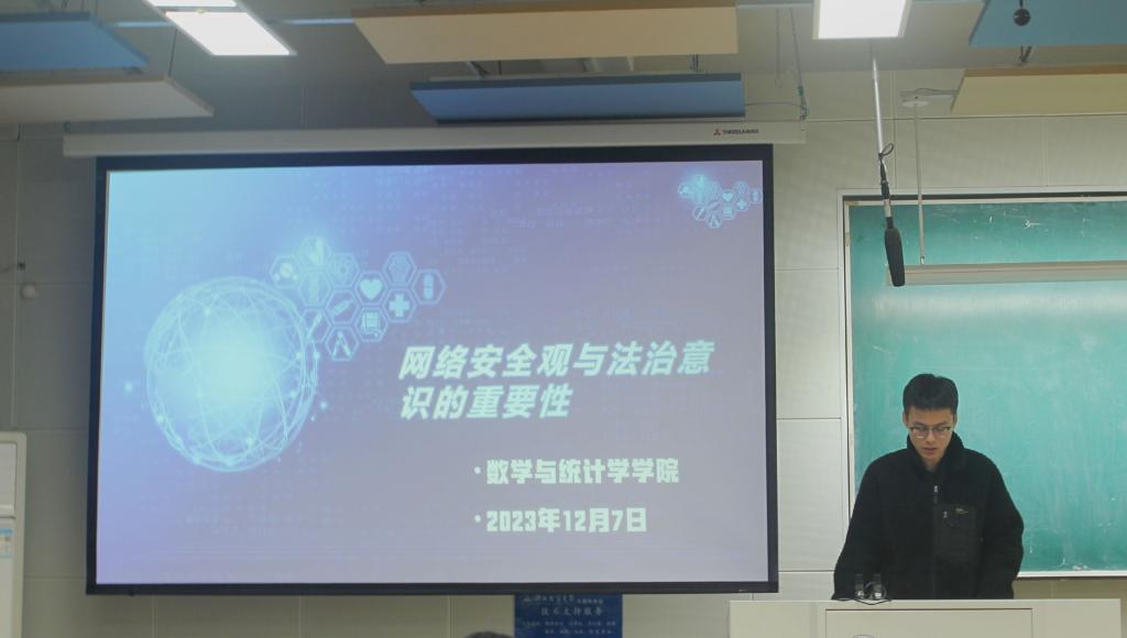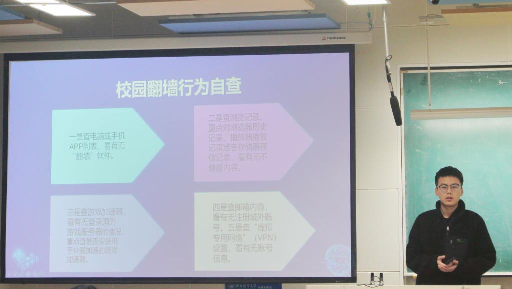 本次宣传教育活动主题为“网络安全观与法治意识的重要性”。首先,田佳伟向大家介绍了网络安全的定义以及树立网络安全观的重要性。他通过短视频的形式向同学们详细介绍了违法上网的反面案例,引导大家规范自己的上网行为,自觉抵制诱惑、严于律己,做依法用网的“明白人”。接着,他讲述了网络翻墙等行为的风险与危害,并从法律层面阐述网络翻墙行为是违反国家法律法规、危害国家安全的行为,号召大家拒绝网络翻墙行为,增强大家对网络“翻墙”等网络行为安全问题的认识,提高自我保护能力和网络信息素养。最后,他倡导同学们要树立正确的网络安全观念和文明上网意识,正确用网、文明上网、安全用网,共同营造良好的校园和谐平安环境。