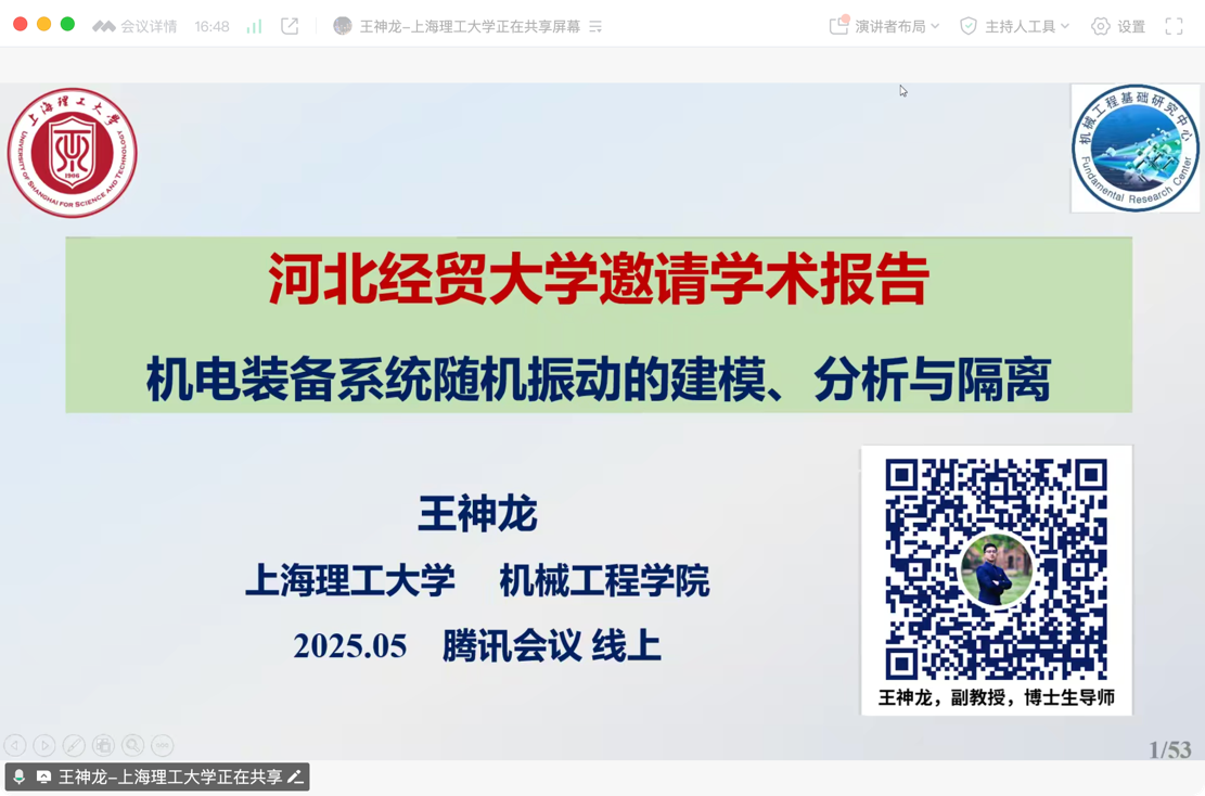 5月17日上午,上海理工大学王神龙教授应太阳成集团tyc7111cc邀请在线上作题为“机电装备系统随机振动的建模、分析与隔离”的学术报告,相关专业师生20余人参会。