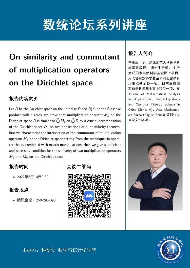 报告题目:On similarity and commutant of multiplication operators on the Dirichlet space