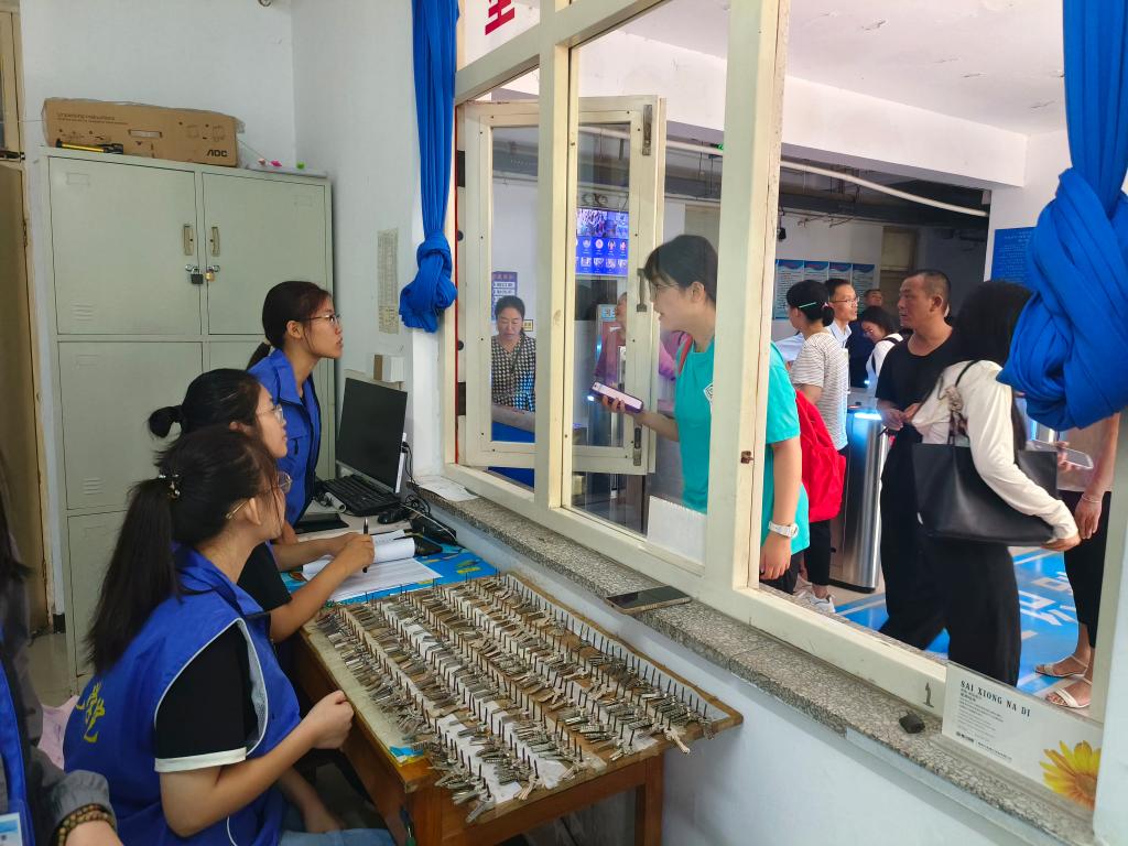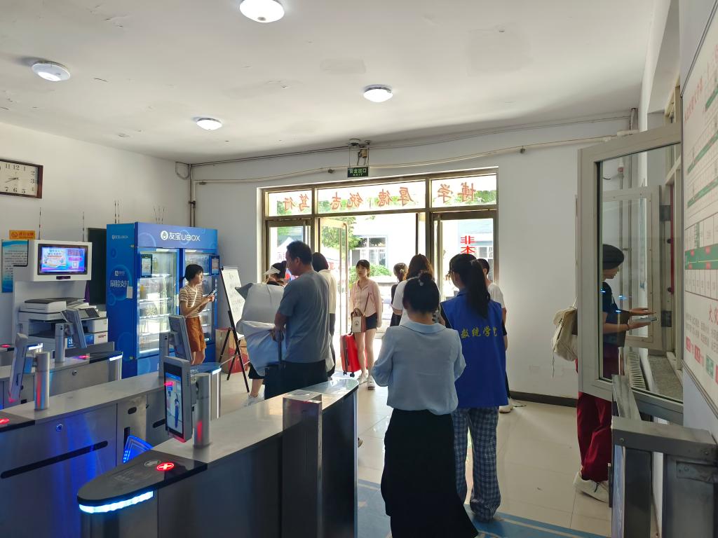 在新生宿舍楼下都有身穿公司标识蓝马甲的志愿者,他们穿行于人群之间,不断为新生与家长答疑解惑,帮助新生搬运行李的忙碌身影,成为了校园迎新一道亮丽的风景线。志愿者王奕飞说:“虽然帮助萌新们搬运行李有些累,但是能为他们提供力所能及的帮助,我们累并快乐着。”