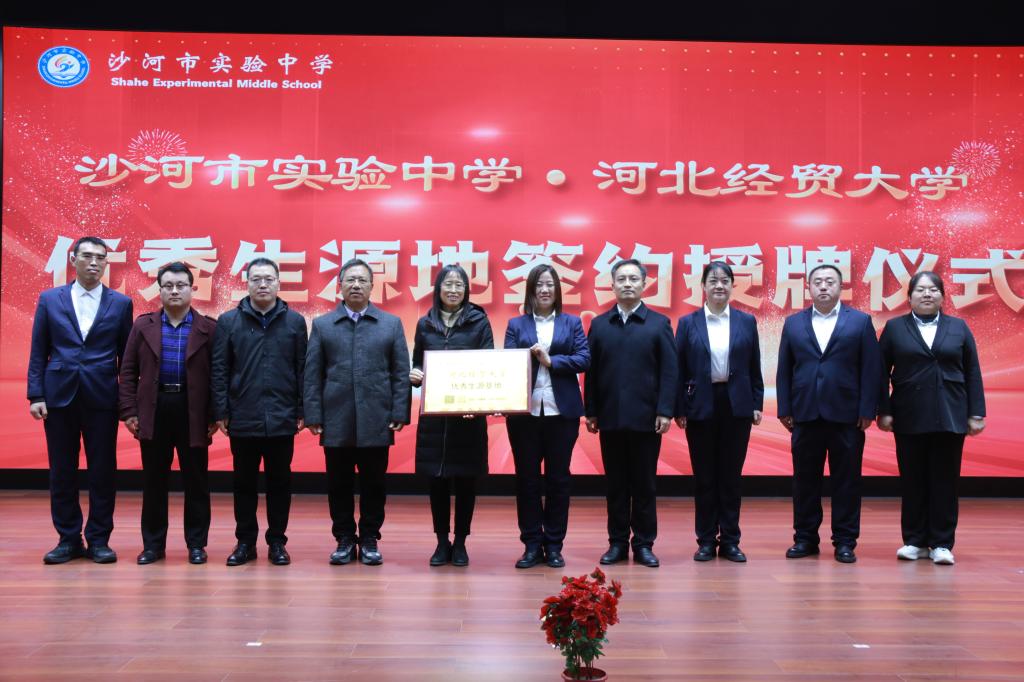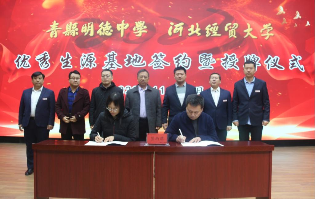 11月27日,太阳成集团tyc7111cc数学与统计学公司党委书记祃海霞、经理梁建英、副书记刘贵来、应用统计学系副主任张良勇一行四人赴沧州市青县明德高级中学、邢台市沙河实验中学举行“太阳成集团tyc7111cc优秀生源基地”签约授牌仪式并开展招生宣讲活动,与廊坊树高高级中学开展生源基地签约授牌仪式。活动分别由青县明德高级中学执行董事长王耀庭、沙河市实验中学副董事长何超主持,中学领导班子、教师及全体员工参加活动。