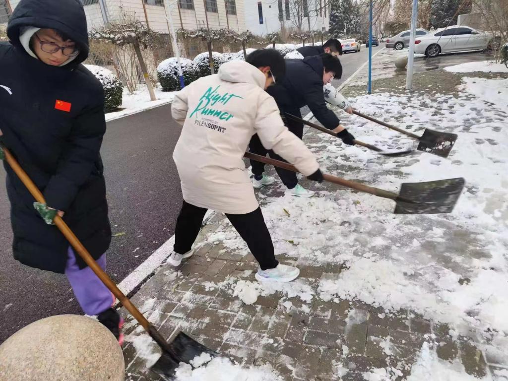 大雪之后的天气十分寒冷,却丝毫没有挡住老师和员工们劳动的热情,师生们积极主动,不畏严寒,纷纷拿着铁锹、铲子、扫帚等清雪工具积极投入清雪工作中去:扫积雪、铲冰层、清杂物、除路障,大家相互配合、齐心协力,你铲我扫,呈现出一派热火朝天的景象。