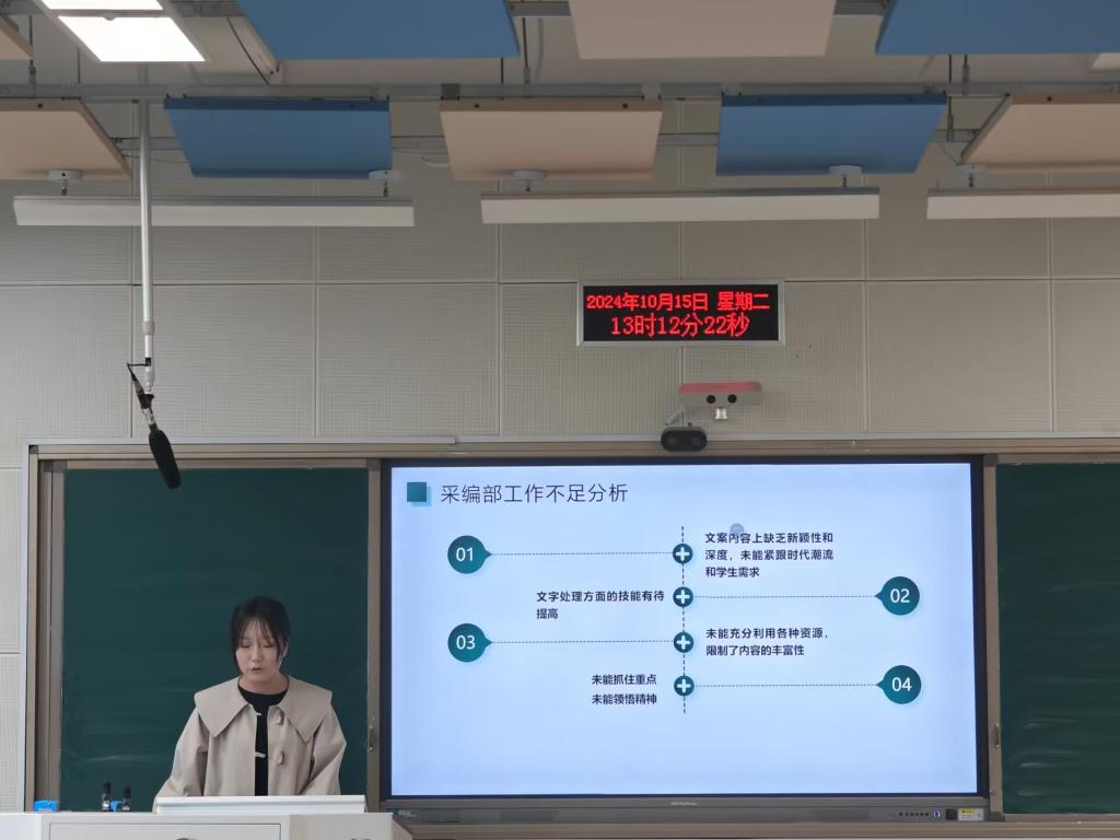 各部门首先进行了工作汇报。部长们以认真负责的态度,详细地汇报了本部门在前一阶段的主要工作、完成情况以及接下来的工作计划。接着,主席团成员就分管部门工作进行部署,要求全体员工会成员目标明确,学会自我管理具备沟通能力,积极承担责任,学会团队协作与配合,在以往工作的基础上,不断创新、追求卓越。