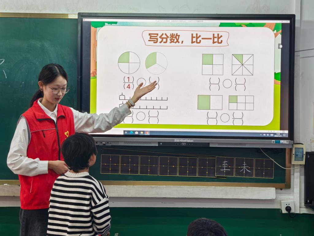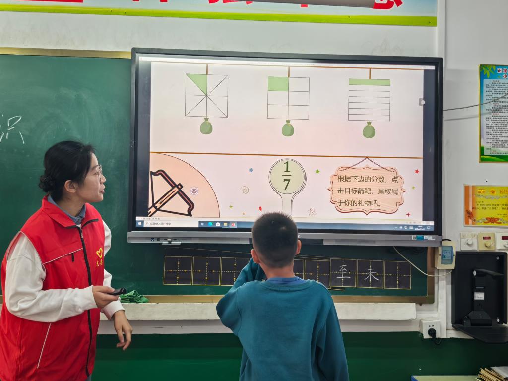 活动现场,丛煜、李志彤、王烁三位志愿者同学为三年级一班的孩子们带来了一堂别开生面的数学课。课堂中,志愿者采用数学家的故事、互动游戏等方式引入数学知识,如吃桃子、分月饼、切巧克力、射击游戏,让员工们在轻松愉快的氛围中学习数学。志愿者鼓励孩子们积极回答问题,引导大家思考问题。