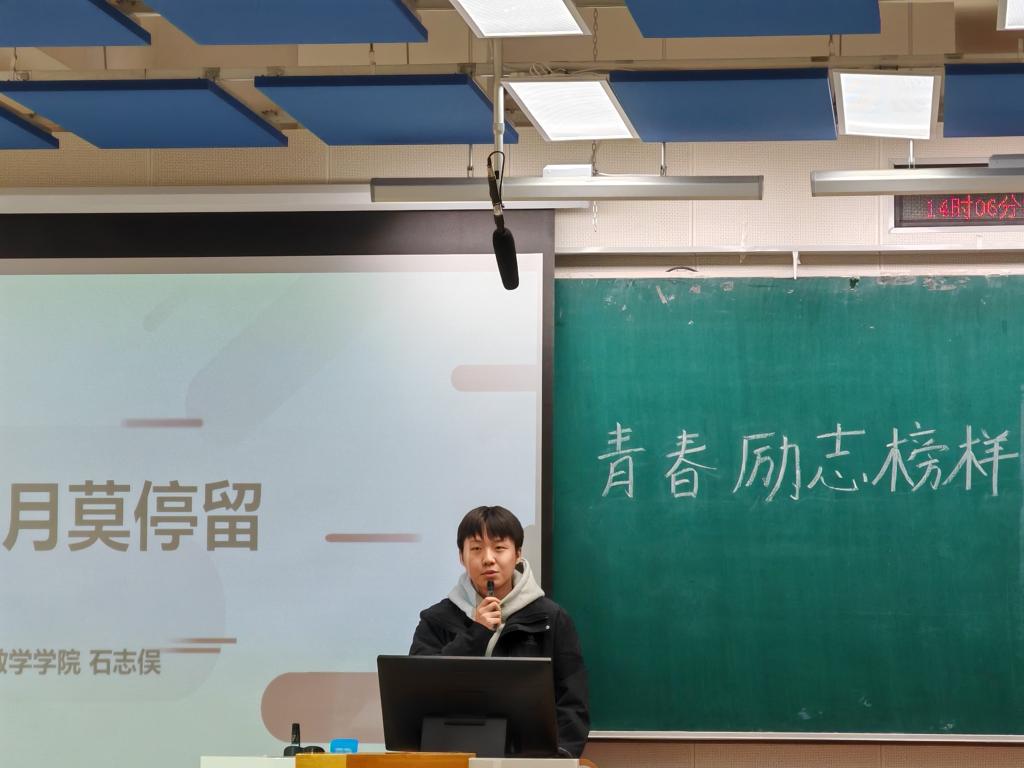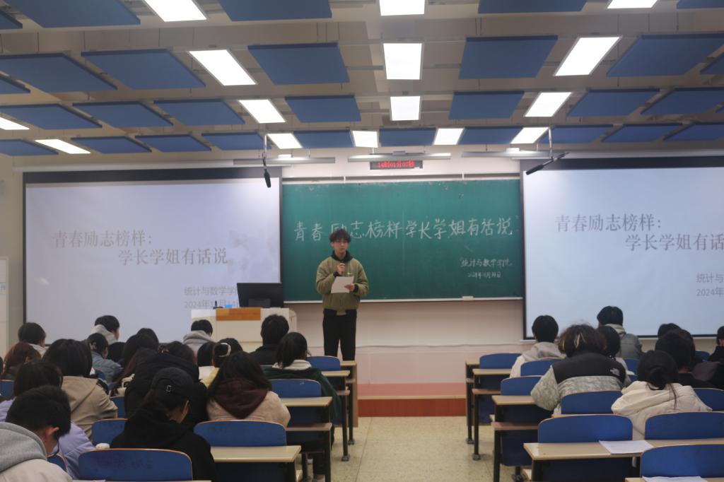 此次分享会邀请到了国家奖学金获得者、21级数学与应用数学一班陈一凡,省级优秀员工干部获得者、21级应用统计学一班石志俣,省级三好员工获得者、21级应用统计学一班黄煊禾,校十佳老员工候选人、21级统计学一班胡忆雯以及院团委副书记、22级统计学一班田佳伟五位优秀的学长学姐代表。