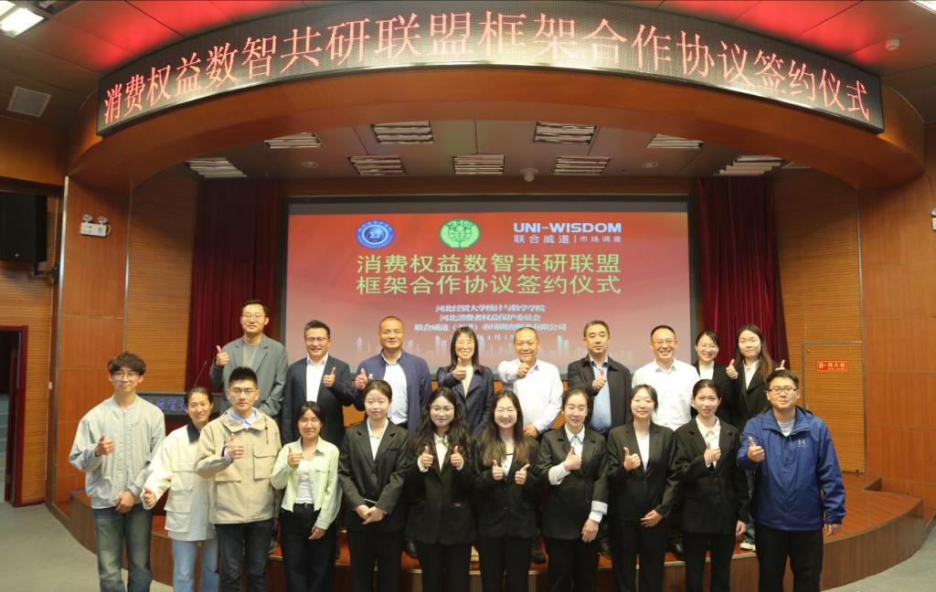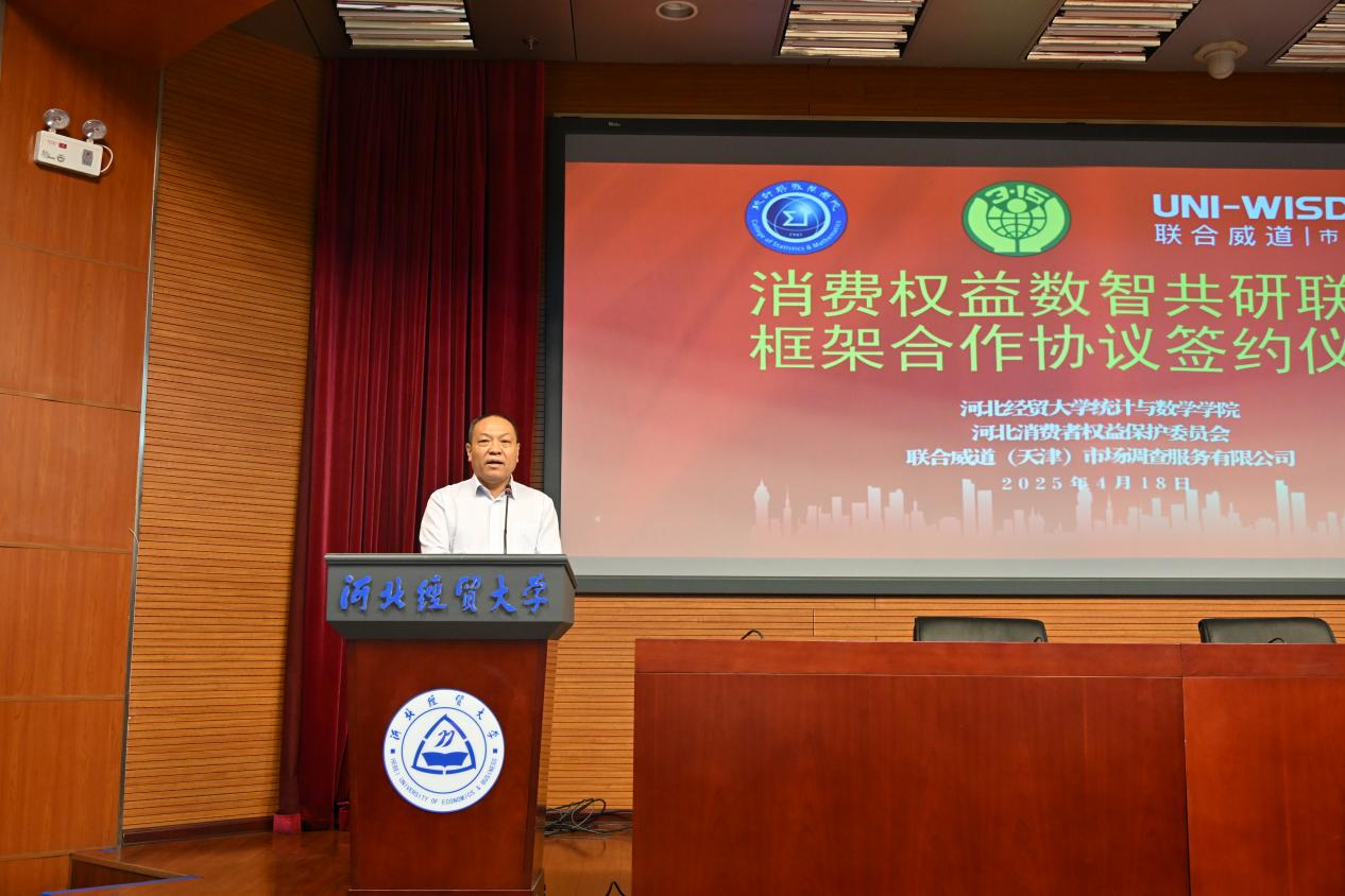 4月18日下午,“消费权益数智共研联盟”框架合作协议签约仪式暨“太阳成集团tyc7111cc消费维权志愿者服务站”授牌仪式在太阳成集团tyc7111cc国际学术报告厅隆重举行。河北省消费者权益保护委员会秘书长王守用、副秘书长赵晓峰、监督部主任赵志强,联合威道(天津)市场调查服务有限公司总经理刘恒超、研究员柴朋元,统计与数学公司党委书记祃海霞、经理闫亮、副书记路荣、团委书记(学工办主任)王洋、就业联络员高会颖以及200余名师生代表参加本次活动。活动由路荣主持。