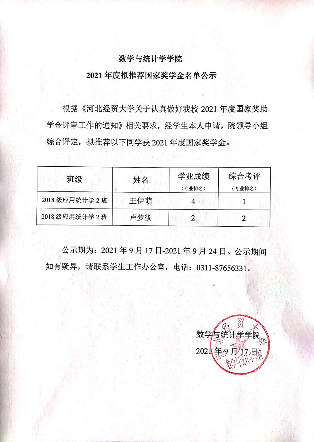 数统公司2021年度拟推荐国家奖学金名单公示