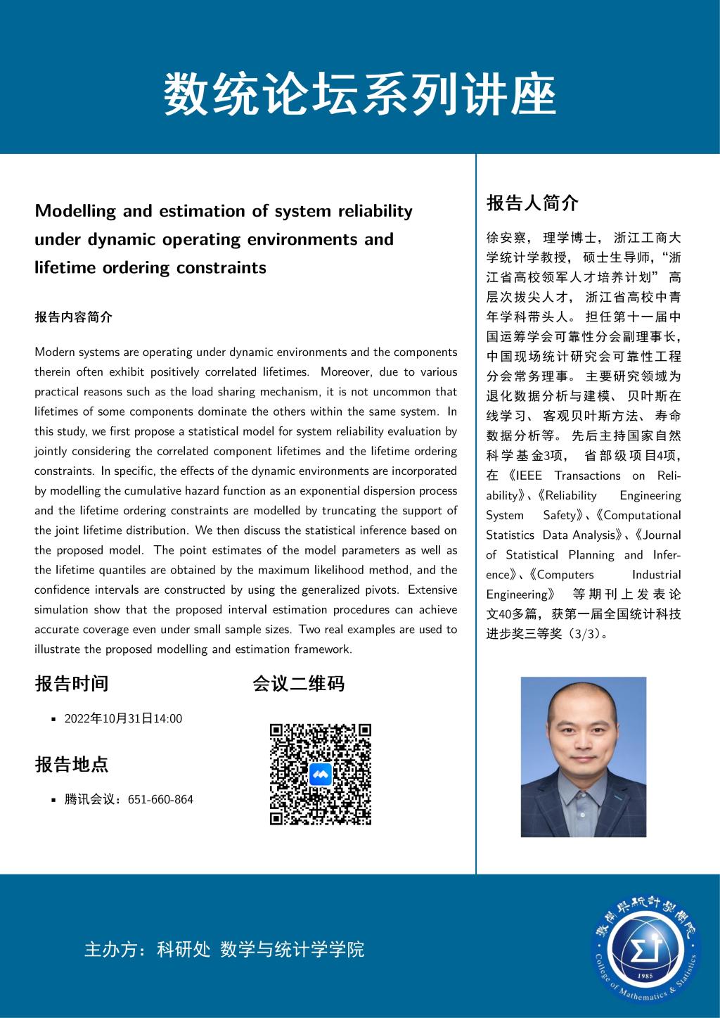 徐安察,理学博士,浙江工商大学统计学教授,硕士生导师,“浙江省高校领军人才培养计划”高层次拔尖人才,浙江省高校中青年学科带头人。担任第十一届中国运筹学会可靠性分会副理事长,中国现场统计研究会可靠性工程分会常务理事。主要研究领域为退化数据分析与建模、贝叶斯在线学习、客观贝叶斯方法、寿命数据分析等。
