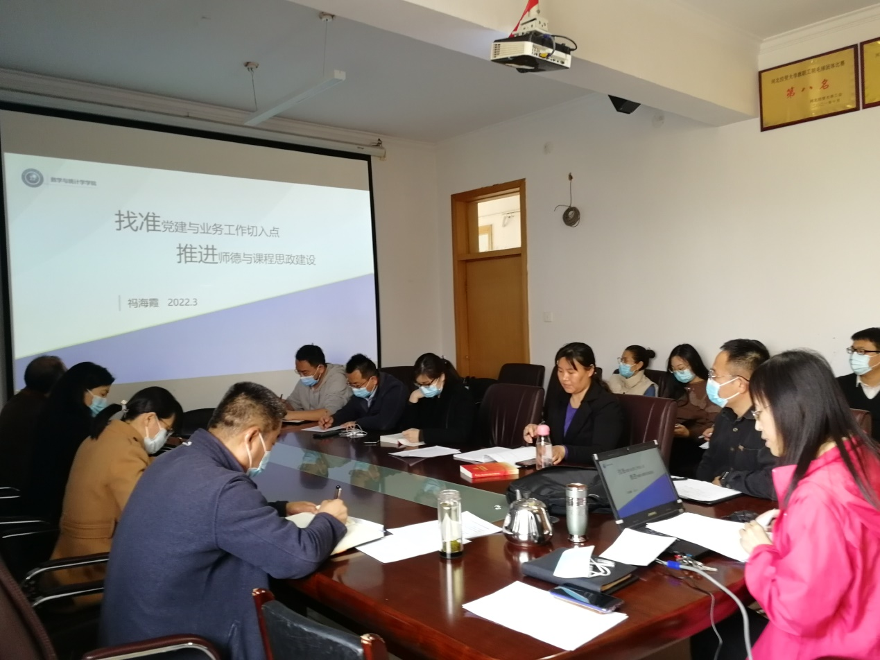 2022年3月10日,由教学评估与教师教学发展中心主办、数学与统计学公司承办的本年度第1期教学沙龙在公司会议室顺利举行。公司党委书记祃海霞教授做“找准党建与业务工作切入点,推进师德与课程思政建设”交流分享,公司各党支部书记、教研室(系)主任、辅导员及部分教师等20余人参加。这也是公司党委本年度首次党支部书记业务培训活动。