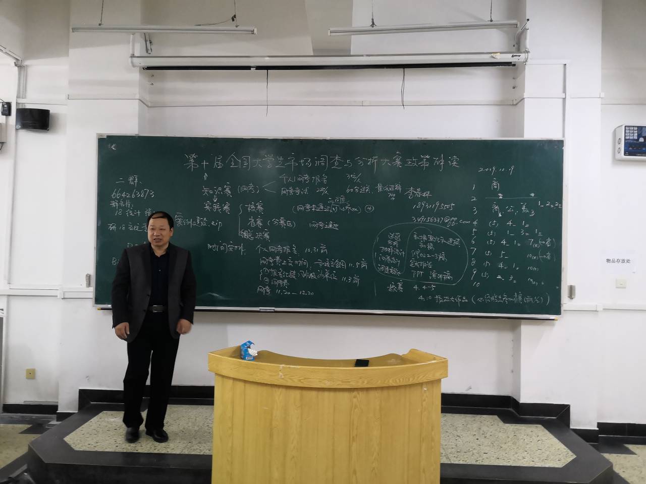10月19日早8点,全国老员工市场调查与分析大赛政策解读讲座于北三教B101举办,数学与统计学公司原副经理李春林老师担任主讲,全体本科生、研究生参赛者参加。