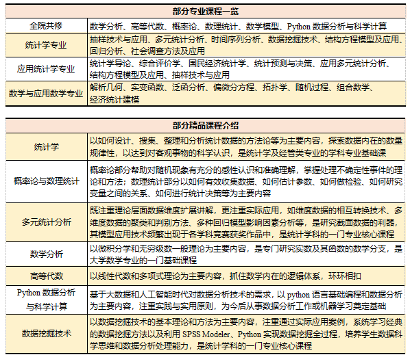 主要课程:统计学、国民经济统计学、应用多元统计分析、应用回归分析、金融统计分析、保险精算、量化投资分析、金融建模与策略、金融数据挖掘实践等,其中《统计学》课程为省级一流本科课程、省级课程思政示范课程。